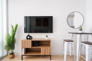 The air-conditioned living space includes a fully equipped kitchen with an oven, microwave, and tea and coffee maker. The apartment provides free Wi-Fi throughout, a TV for entertainment, and a washing machine for convenience. A desk and wardrobe are available inside the room along with linens, towels, heating for colder seasons, and a hairdryer in the bathroom.