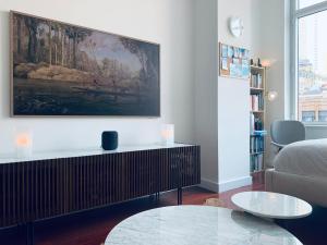 The apartment includes a living room with a flat-screen TV equipped with streaming services and a kitchenette complete with a dishwasher and oven. The bathroom provides slippers and has a shower along with air conditioning throughout the unit. Soundproofing ensures privacy while bed linen and towels are available for guests.