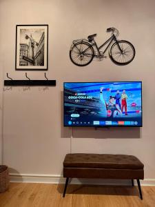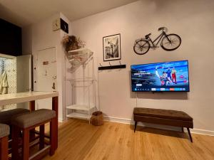 The apartment features a dining area and a fully equipped kitchen with an oven, microwave, kettle, and kitchenware for meal preparation. Guests can enjoy entertainment on the flat-screen TV with streaming services like Netflix or use books, DVDs, and music provided for children. The sleeping area includes hypoallergenic pillows and linens on hardwood floors within a non-smoking environment featuring air conditioning and heating.