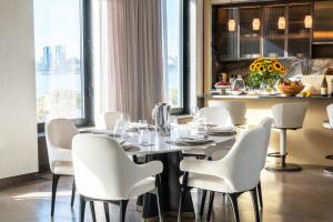 The hotel provides non-smoking family rooms with private bathrooms, some equipped with kitchens that include fridges and dishwashers. Guests can enjoy views of the river, city, or landmarks from their rooms, which also contain walk-in closets, clothes racks, cribs on request, air conditioning, and amenities such as bathrobes and hairdryers. Each room includes a seating area with a flat-screen TV and electrical adapter.