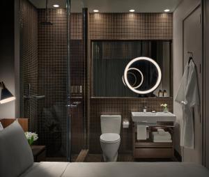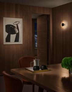 Guest rooms feature floor-to-ceiling glass walls that separate the bathroom from living spaces, wood floors, and air conditioning. Each room includes a walk-in shower or bathtub with Le Labo bath amenities such as shampoo and conditioner. Nespresso coffee machines accompany flat-screen TVs in the living areas where satellite TV and video players are also available. Guests can enjoy complimentary Wi-Fi throughout their stay along with linens, slippers, bathrobes, and bottled water. Family-sized accommodations and allergy-free rooms are offered to meet different needs.