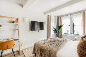 The apartment includes air conditioning and heating for comfort. It provides free Wi-Fi throughout and features a fully equipped kitchen with a microwave and refrigerator. Guests can enjoy entertainment on the TV or work at the desk provided. The private bathroom contains a bathtub and hairdryer, while towels, linens, ironing facilities, and a clothes rack are also available.